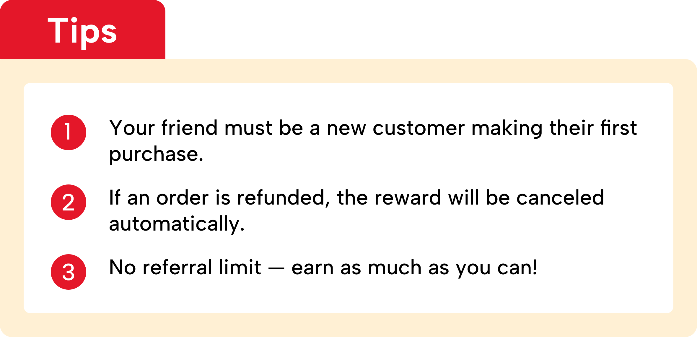 - If the referred order is canceled or refunded, the corresponding reward becomes invalid.