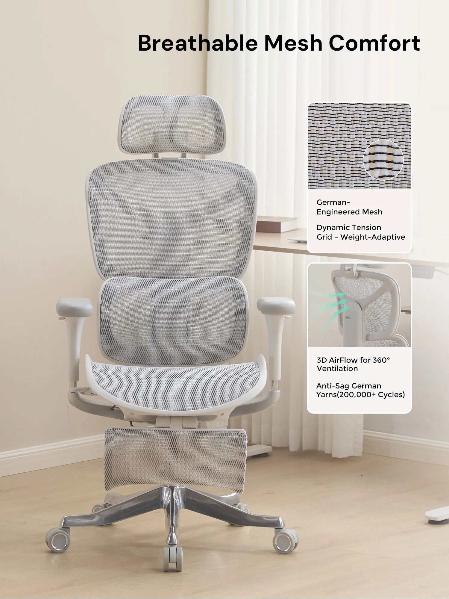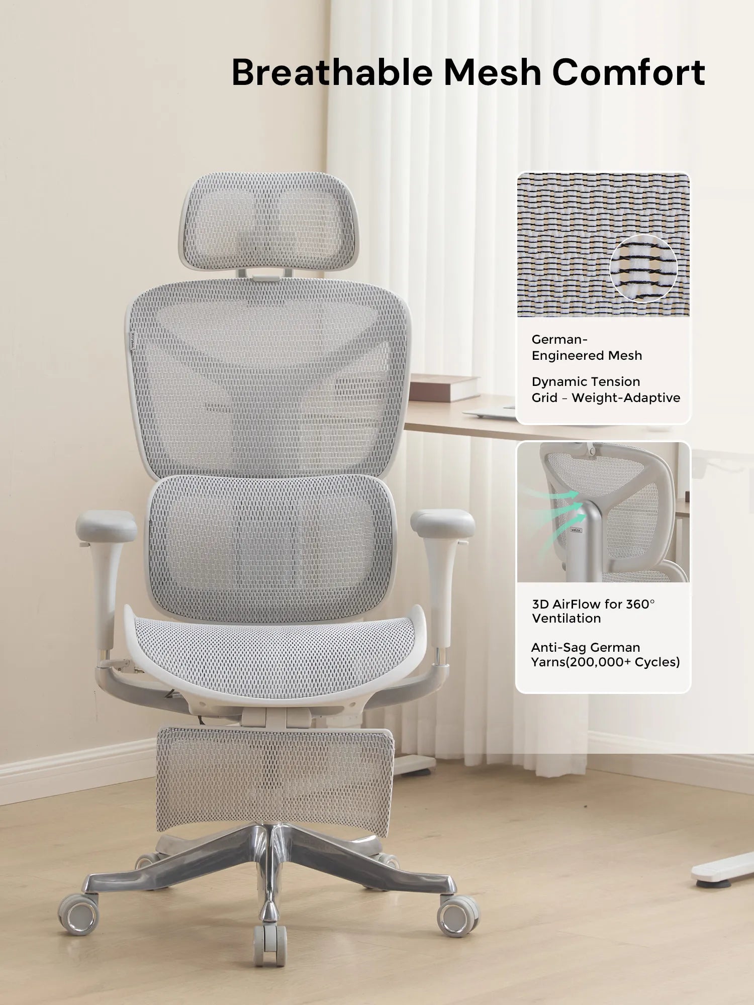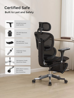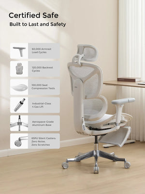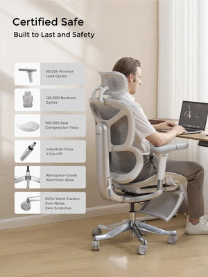 German-imported mesh keeps you cool during long hours. Reinforced aluminum alloy base ensures long-lasting stability and strength.