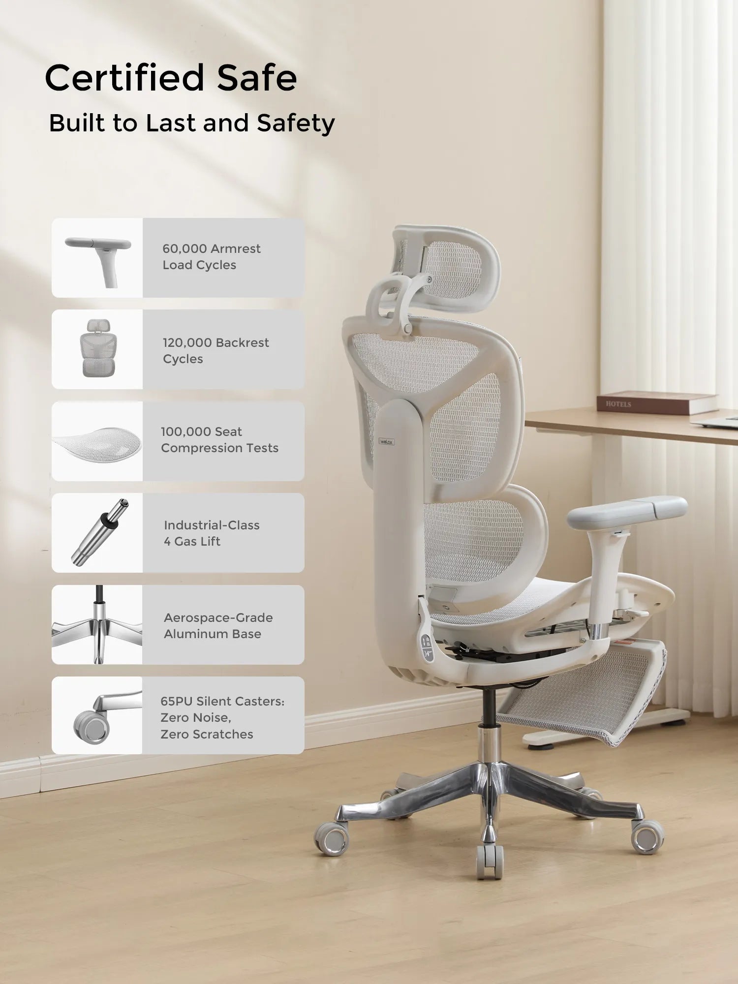 Smooth PU casters glide quietly across any surface. SGS-certified class-4 gas lift delivers safe, stable height adjustment for daily use.