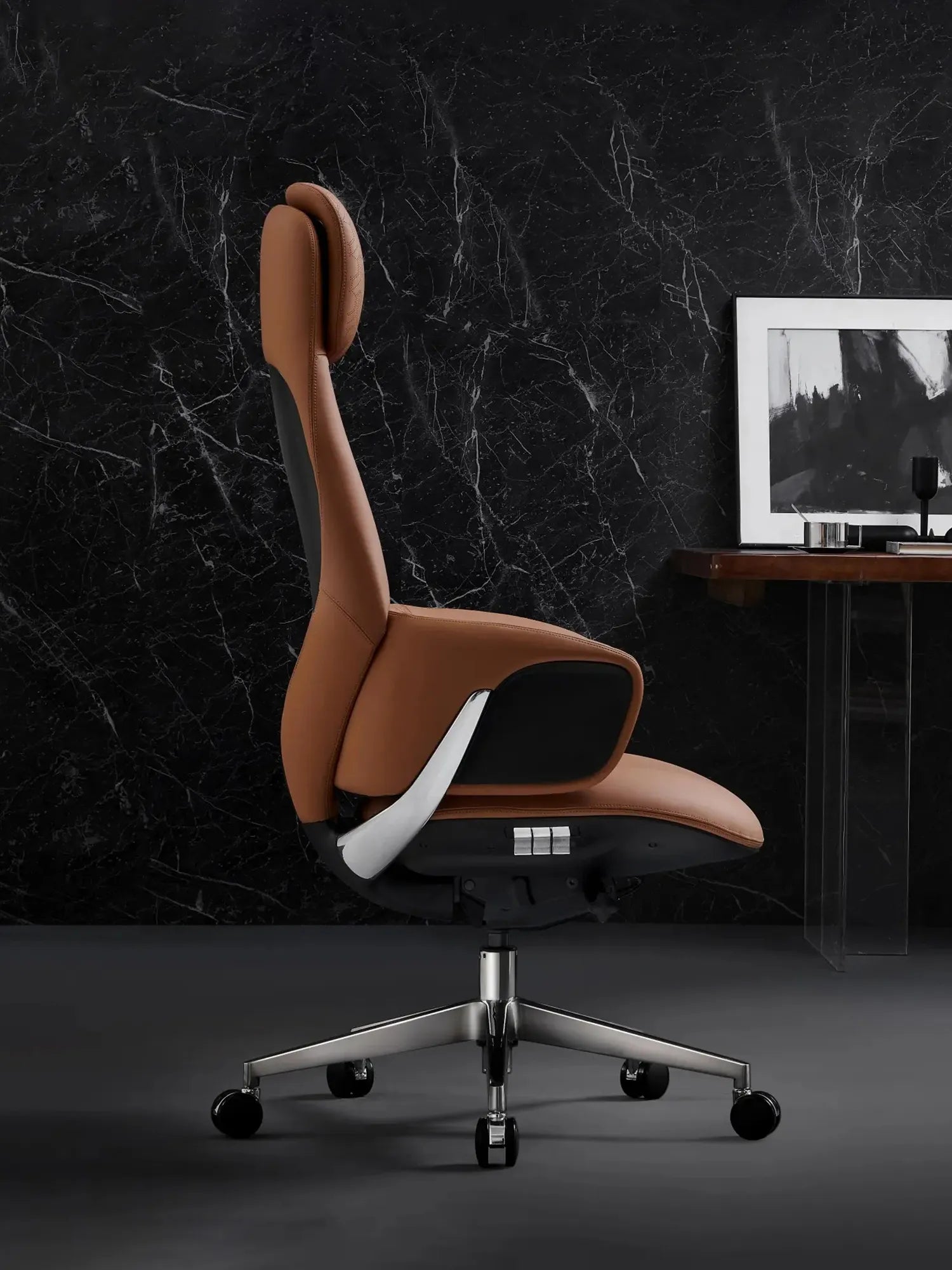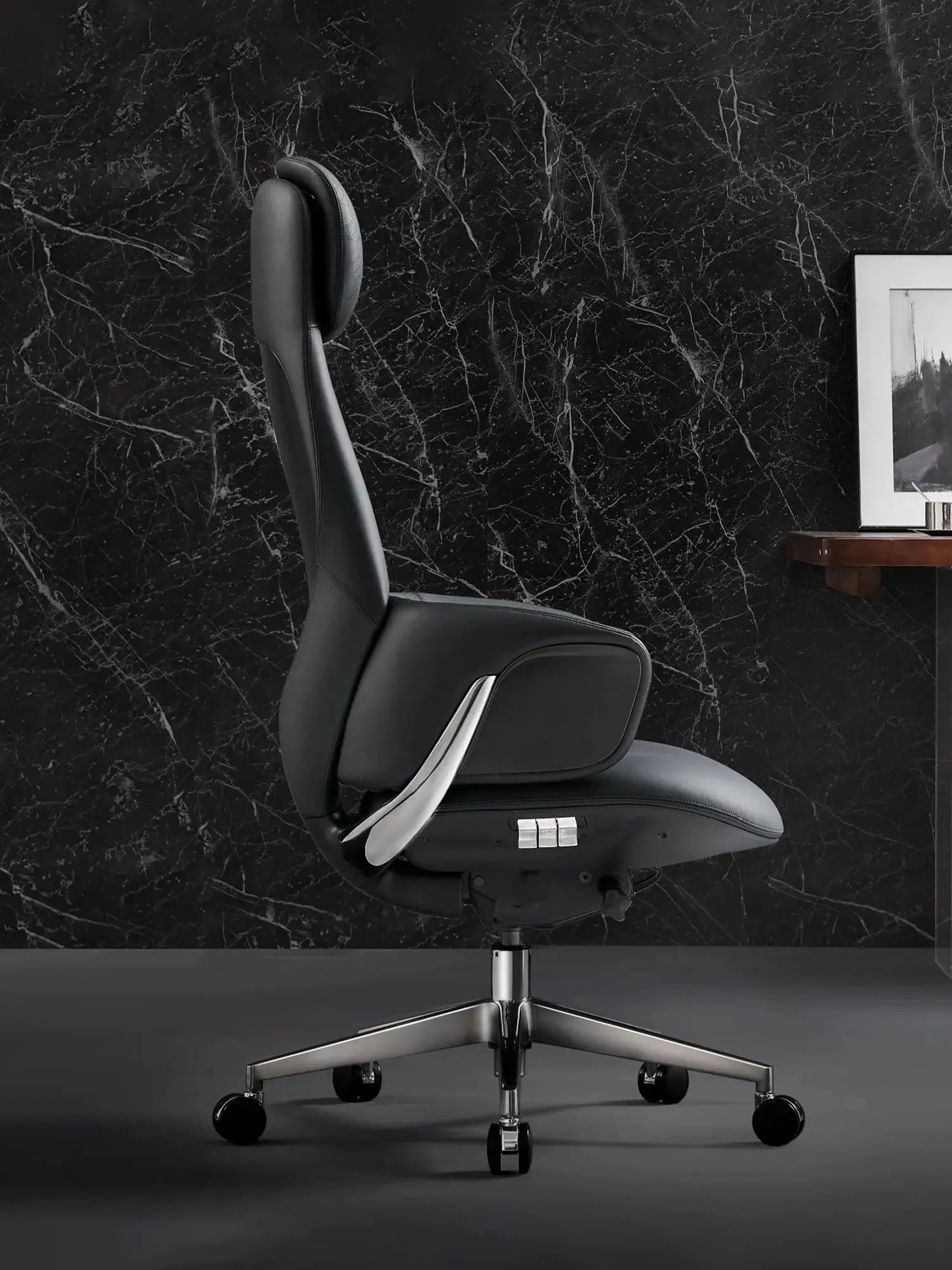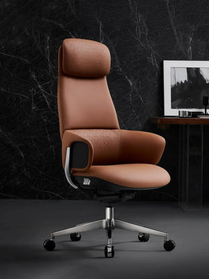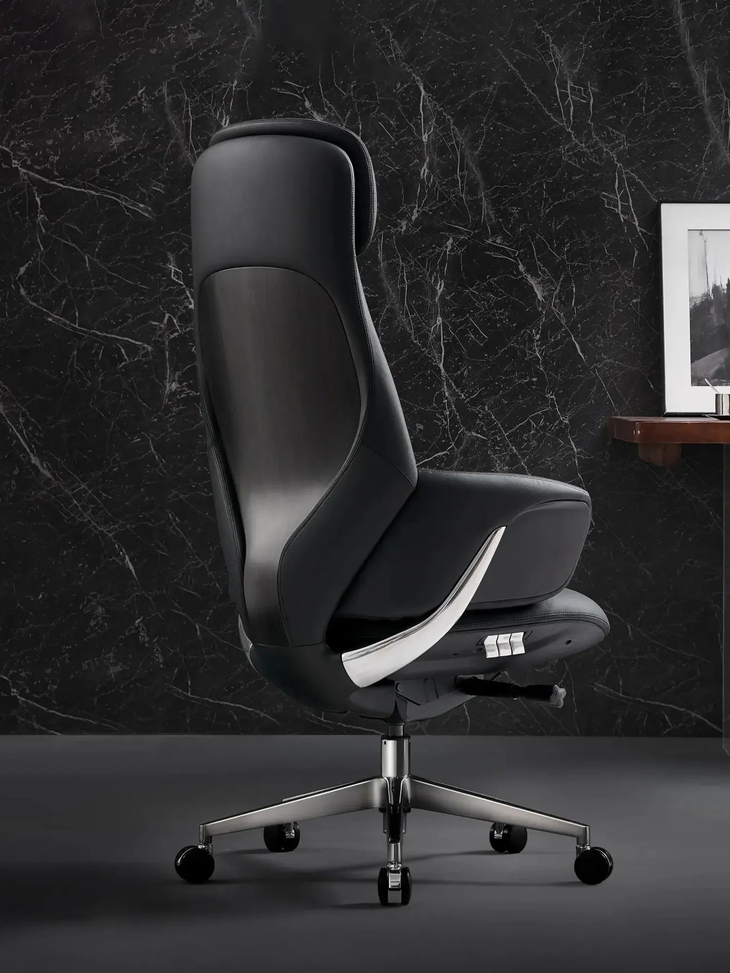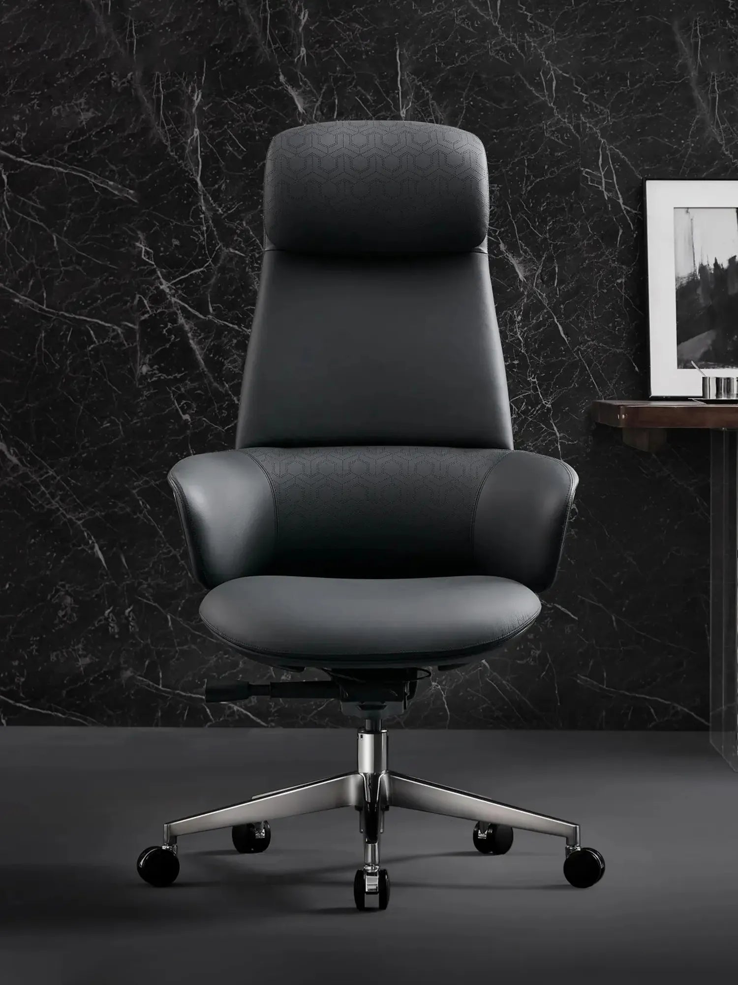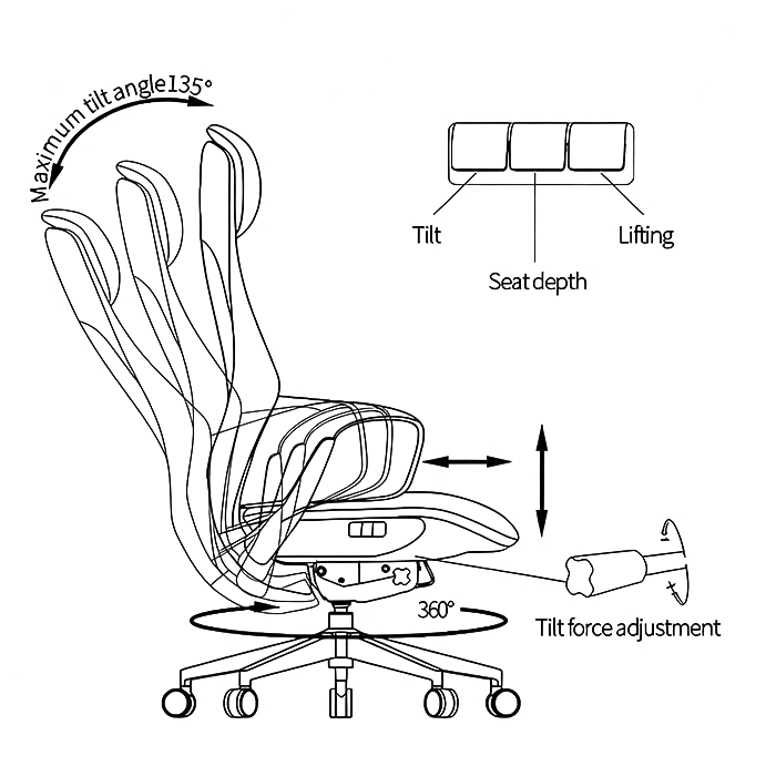 The high-back chair can be rotated 360 degrees, adjusted for sitting height, sitting depth, tilted the back synchronously, and locked tilt angle steplessly, adjusted for tilt force.